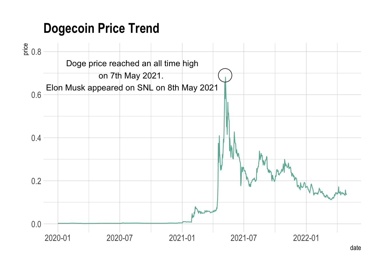 As observed in the heatmap above, there does not seem to be any strong correlation apparent. This could be due to the fact that we had observed earlier that the hike in tweet frequency volume precedes the price hike and do not occur simultaneously.