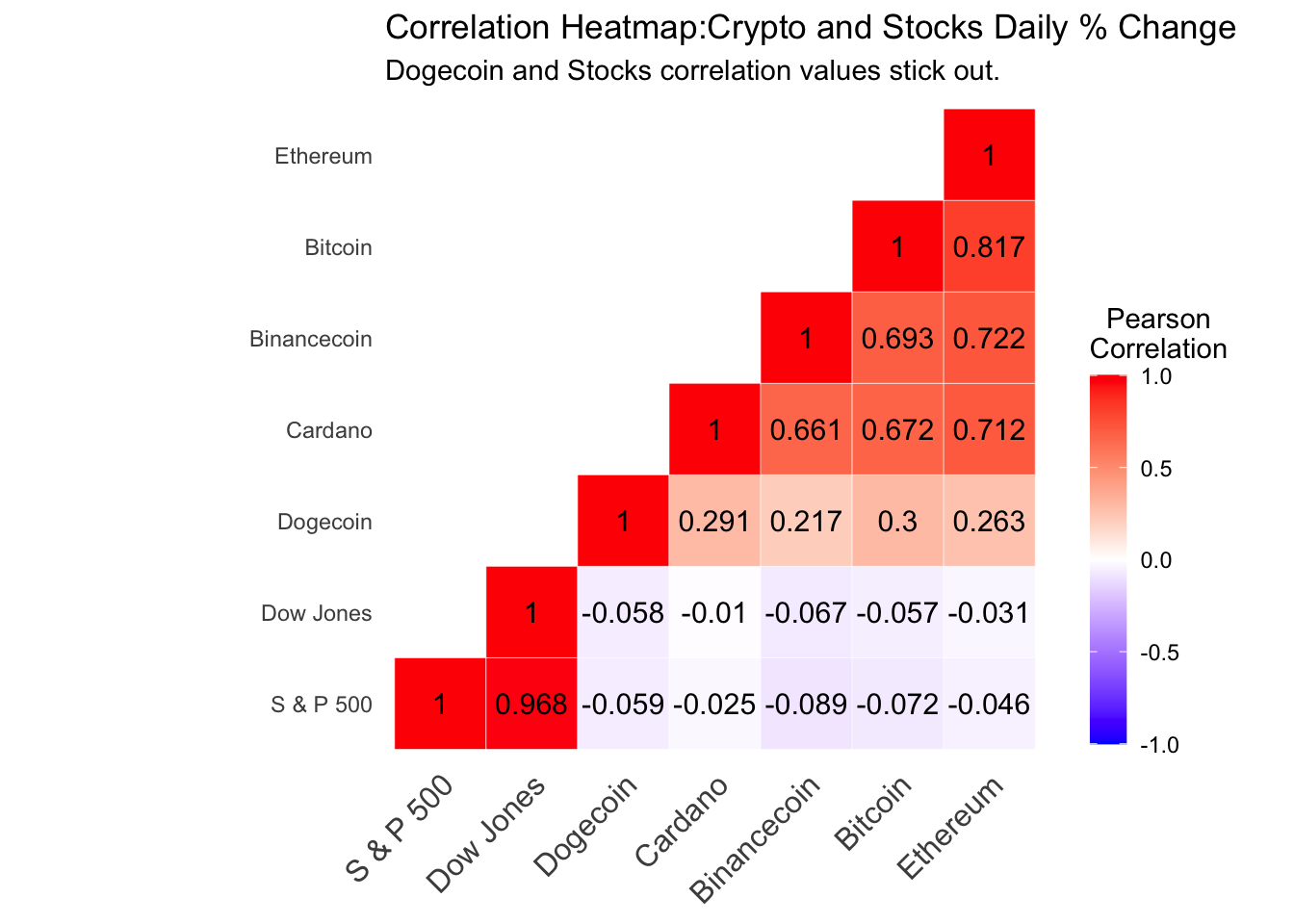 We can also confirm what we saw previously in that the Dow Jones and S&P 500 are very much in sync. In addition, the correlation between the stock market representatives and the cryptos are effectively 0, showing no change or relationship with respect to each other.